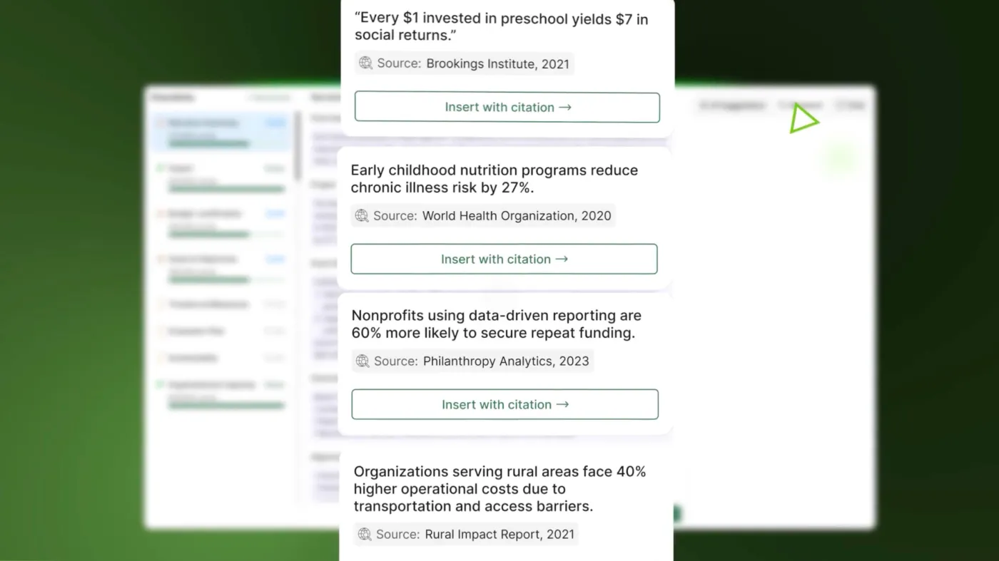 Transform any RFP into a structured outline, then generate compelling narrative sections that align with funder priorities while maintaining your organization's authentic voice and mission focus.